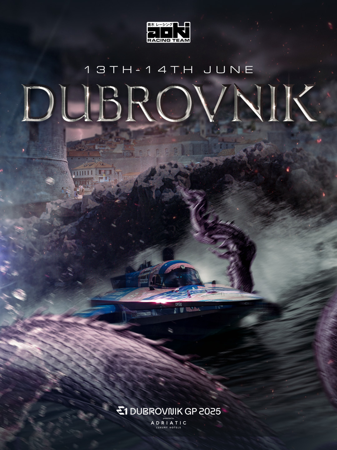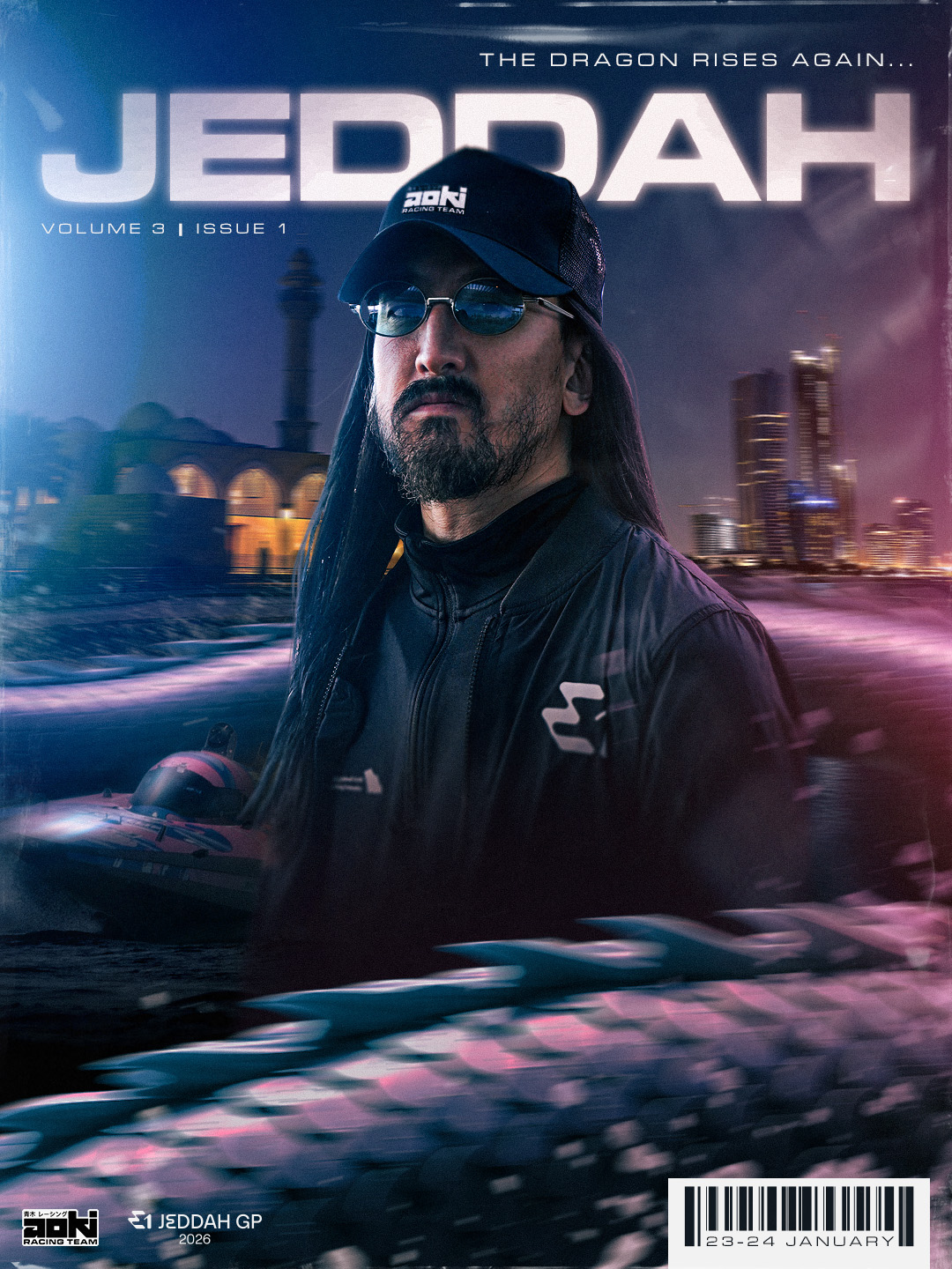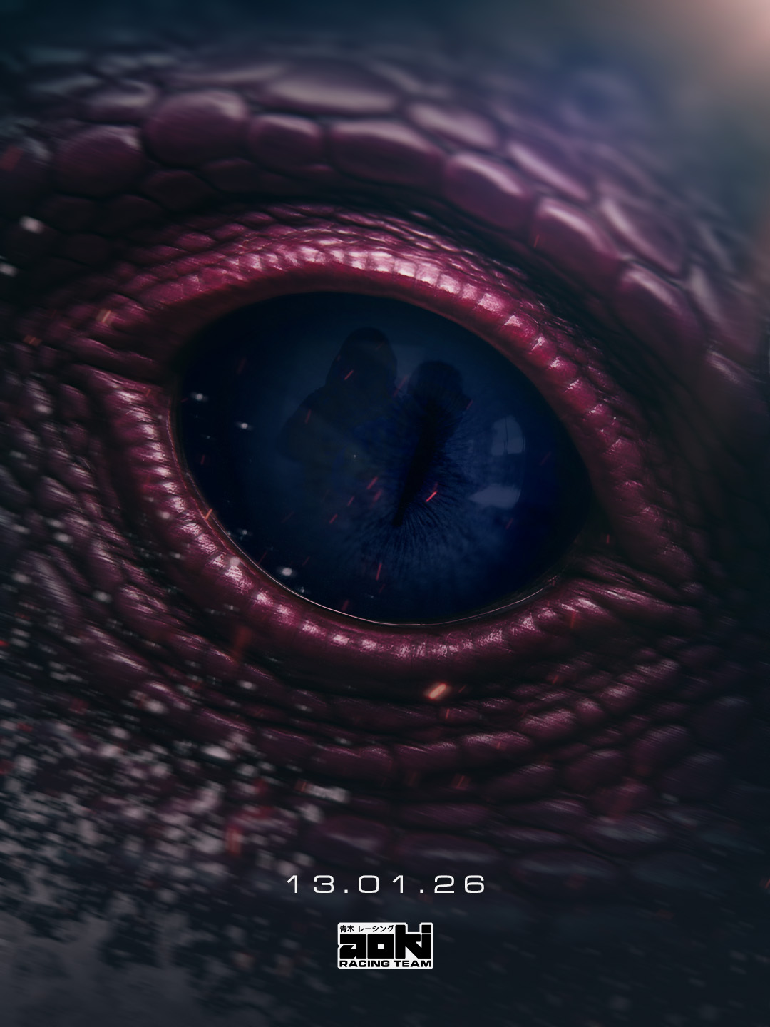I wanted the dragon to feel almost like the third member of the team – the final piece which would push Aoki Racing Team to victory. I carried the dragon theme throughout the race weekend graphics using the scales from the livery and a 3D dragon asset.