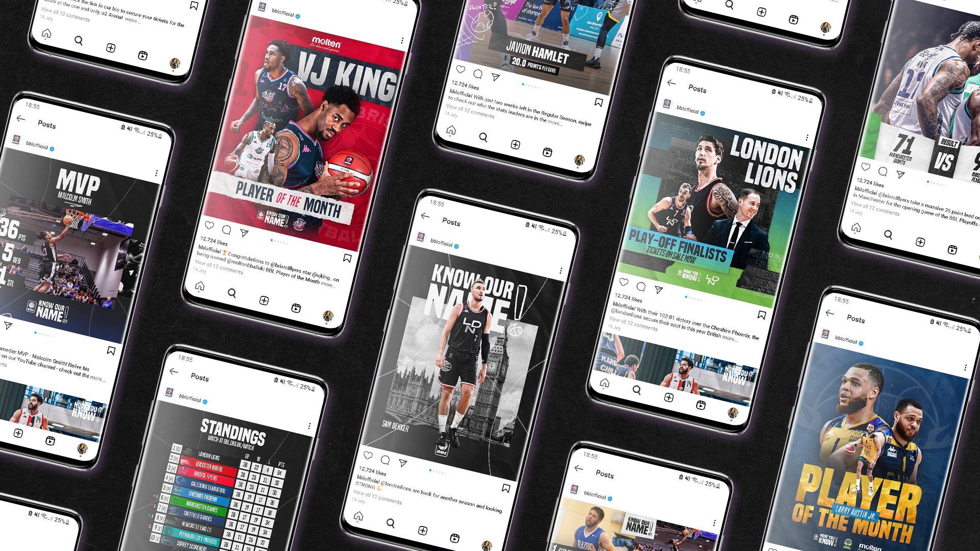 Having been heavily involved in a successful pitch, a handful of concept graphics turned into 1000+ assets across the season. Know Our Name centred around making local heroes of players and fuelling friendly rivalries as British Basketball aims to make its mark on the UK’s sporting landscape. Inspired by gritty British scenery and the more bright, positive feel of the NBA, I created a visual identity which was rooted in British culture and could be used across multiple channels with room to evolve over the season.