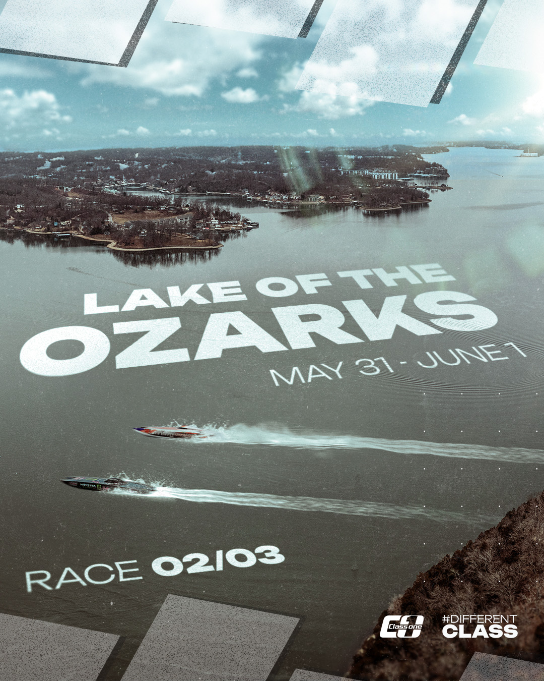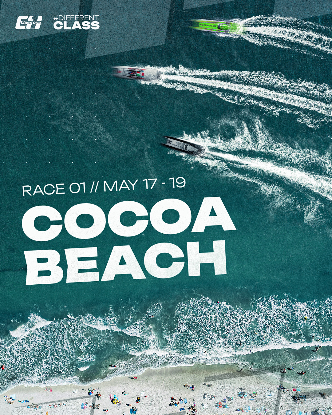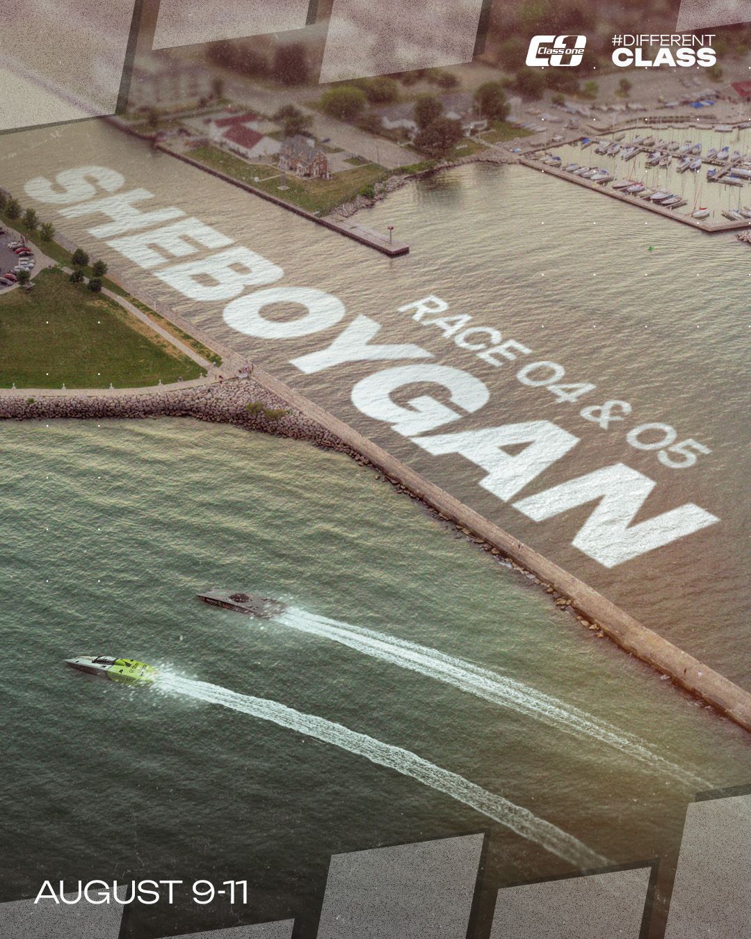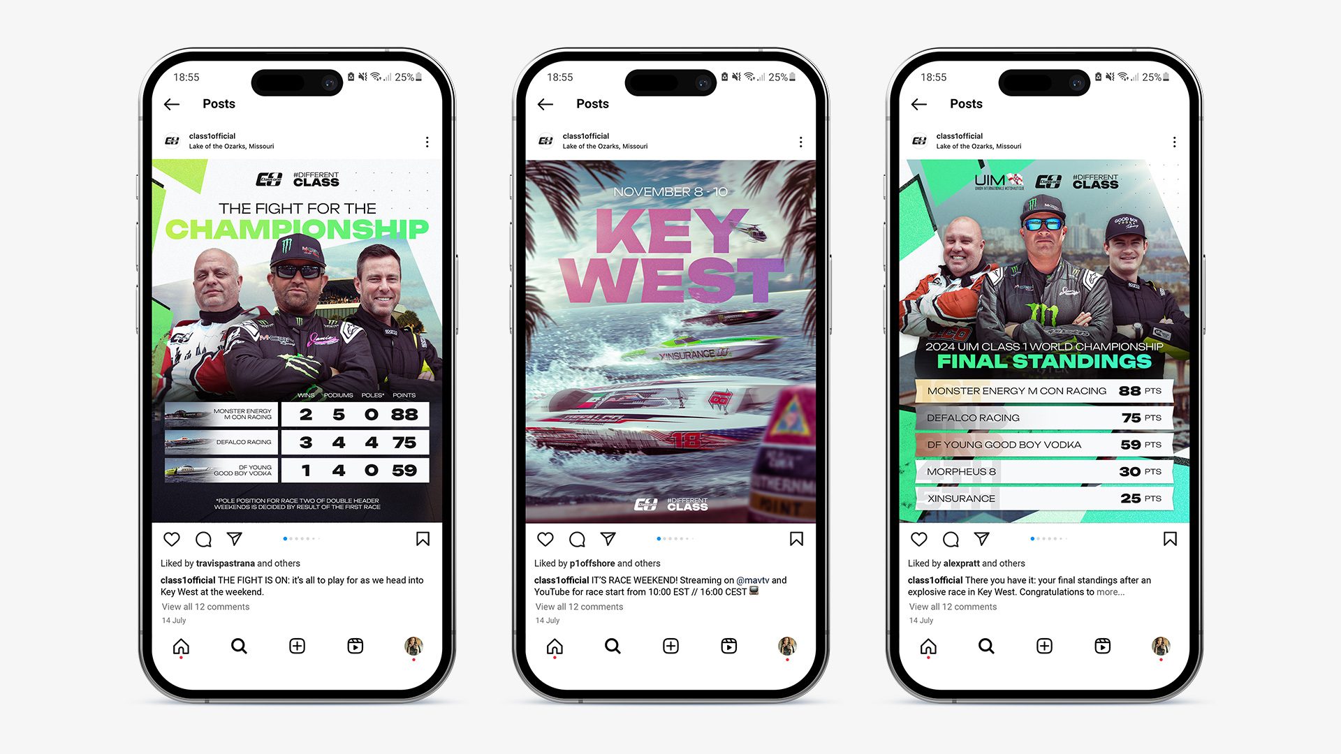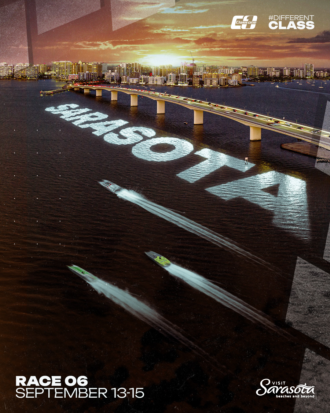 Having worked with a number of boat racing clients, I was keen to bring a different style of race poster to Class 1 this season, and went with the idea of a set of race posters from a birds eye view, zooming out from the boats and showing off the picturesque locations of the season. Of course, the classic hero graphics still had their place – 160mph boat photography never fails to go down well with powerboat racing fans!